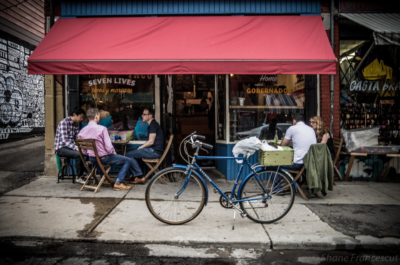 Although you wouldn’t be able to tell, the sun had blazed the streets with a fiery temper that morning. The bicycle you see in the foreground, started off its day with a journey beginning far away from this busy little café. It had been driven along long empty dirt roads and through the rambling green countryside to a small blue house on the edge of a lake. There, a girl lived who owned a red bicycle. Joining them on their ride they continued on, drinking in the scenery and stopping at one point to lay in a warm grassy field as small yellow butterflies fluttered by. At the end of the day the rain begins and they enter a small café for a bite. Here the bicycle waits pleasantly for his owner, a little happier and shinier than usual.